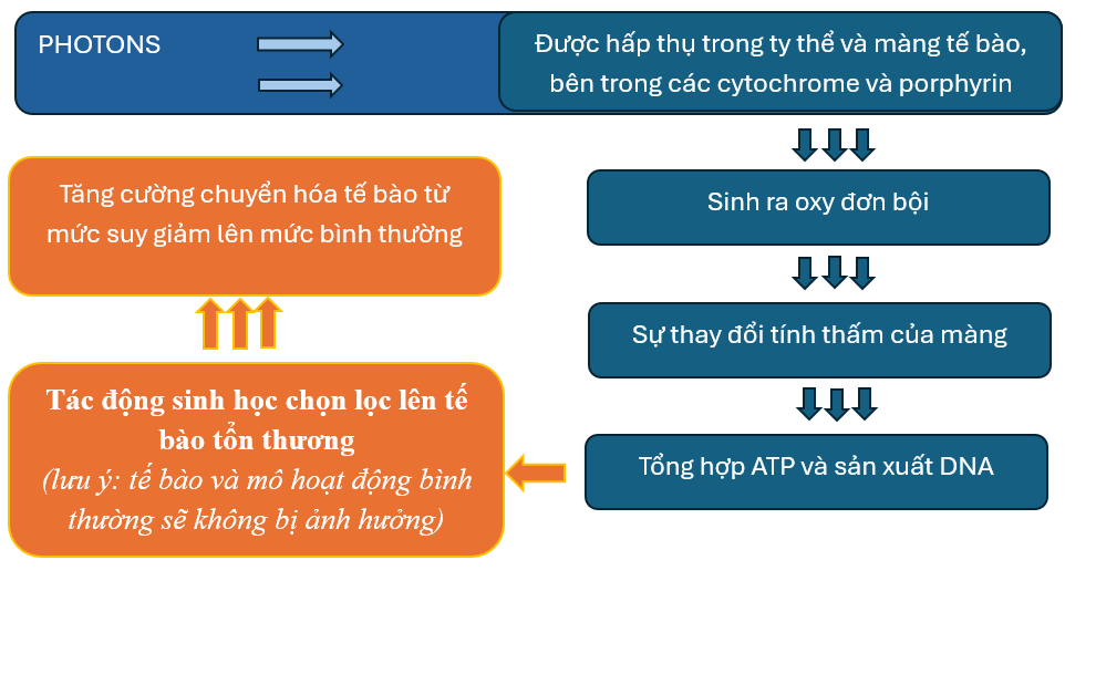Nhờ các đặc tính này tia laser có thể đi xa, không bị phân tán, năng lượng được tập trung tại 1 điểm trong thời gian ngắn. Khi tác động lên mô cơ thể sẽ sảy ra quá trình quang hóa